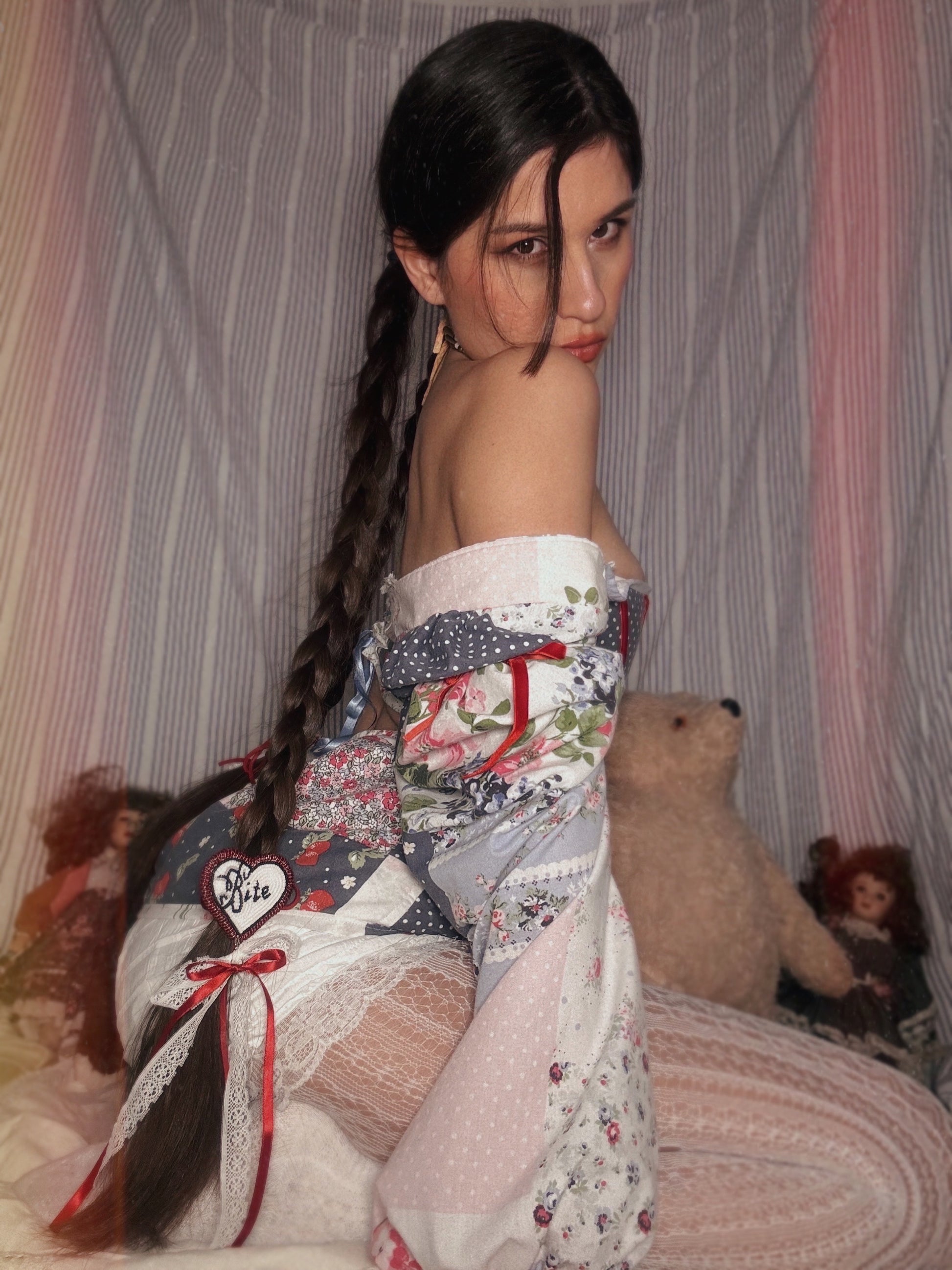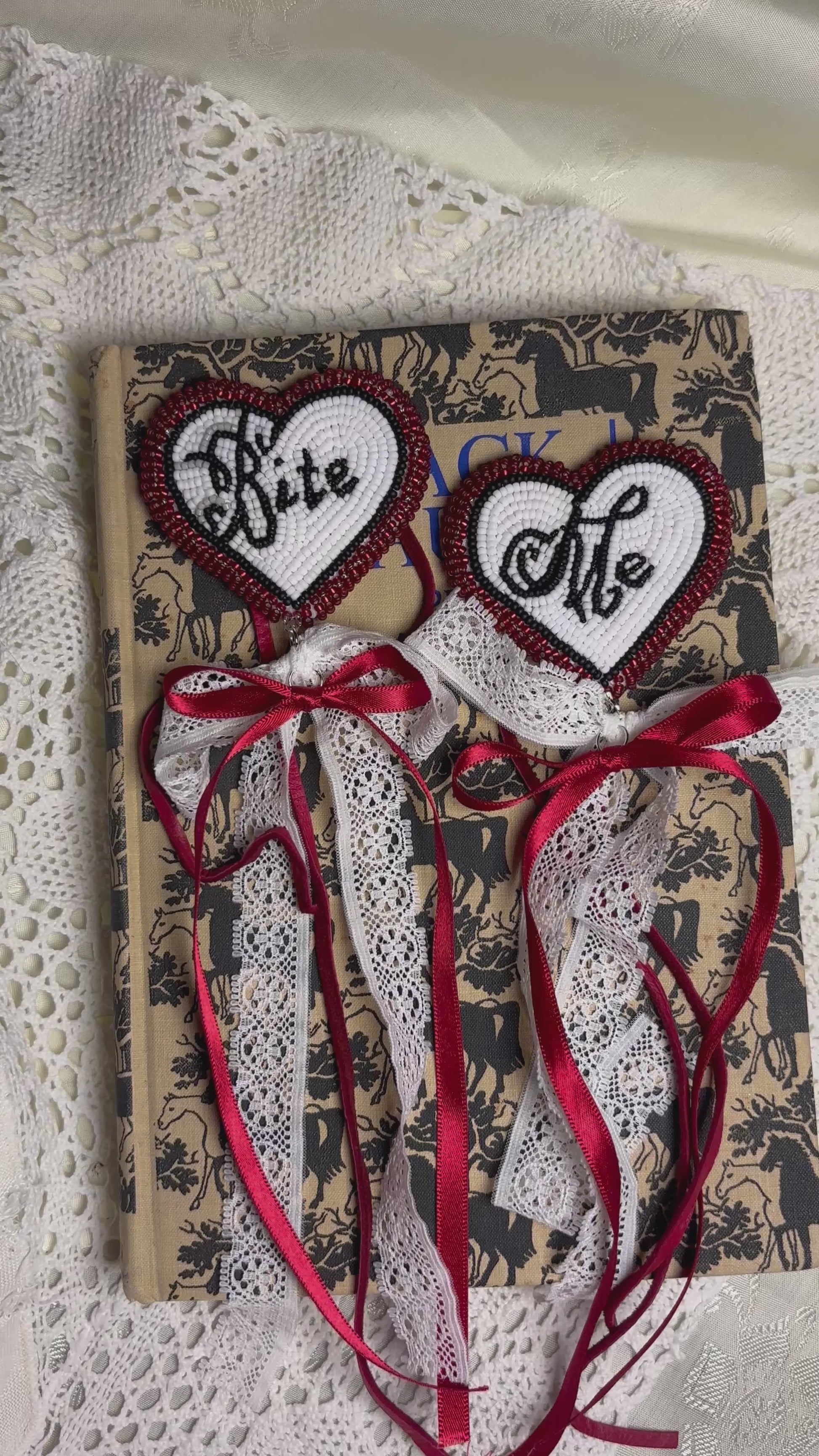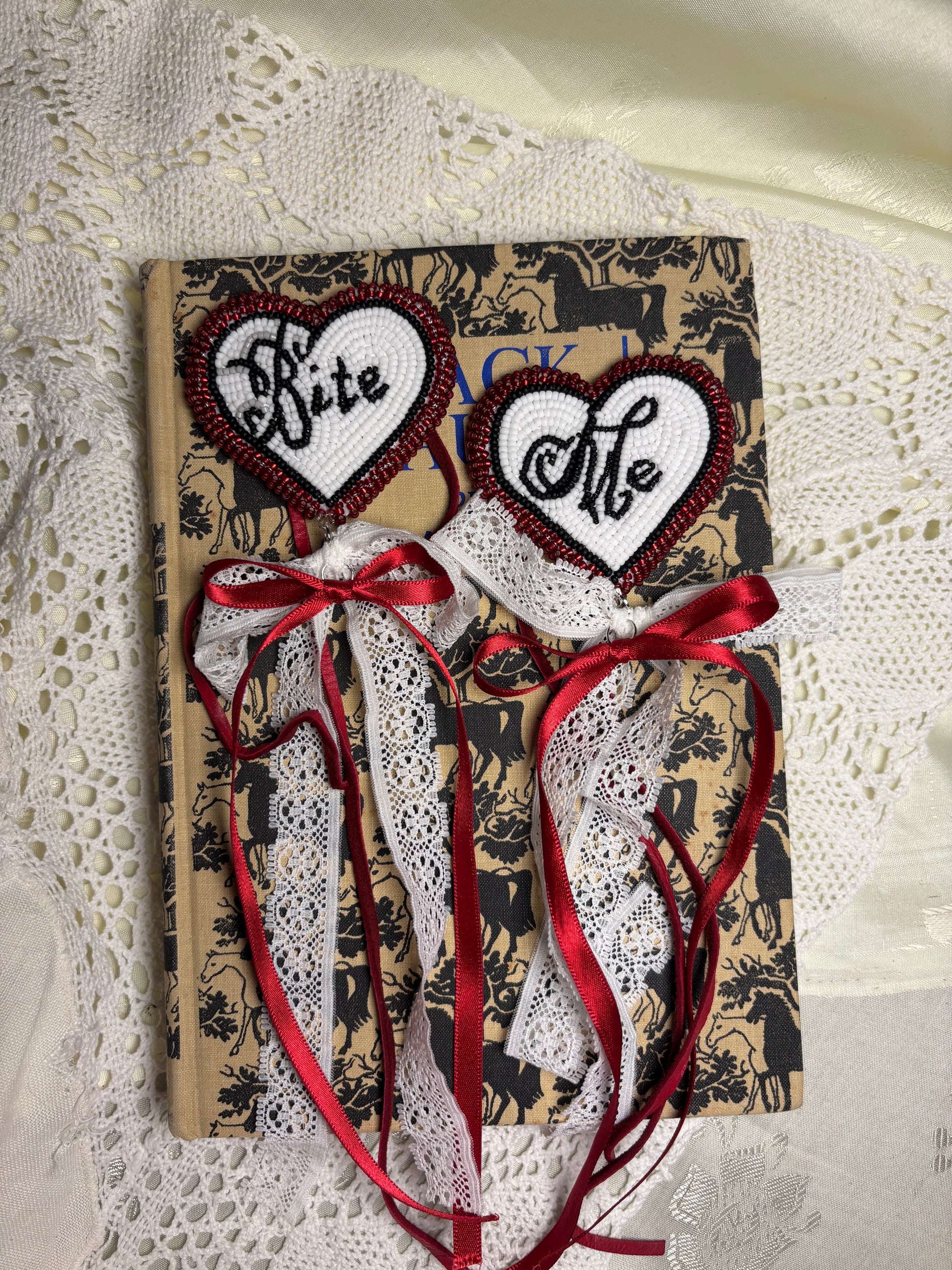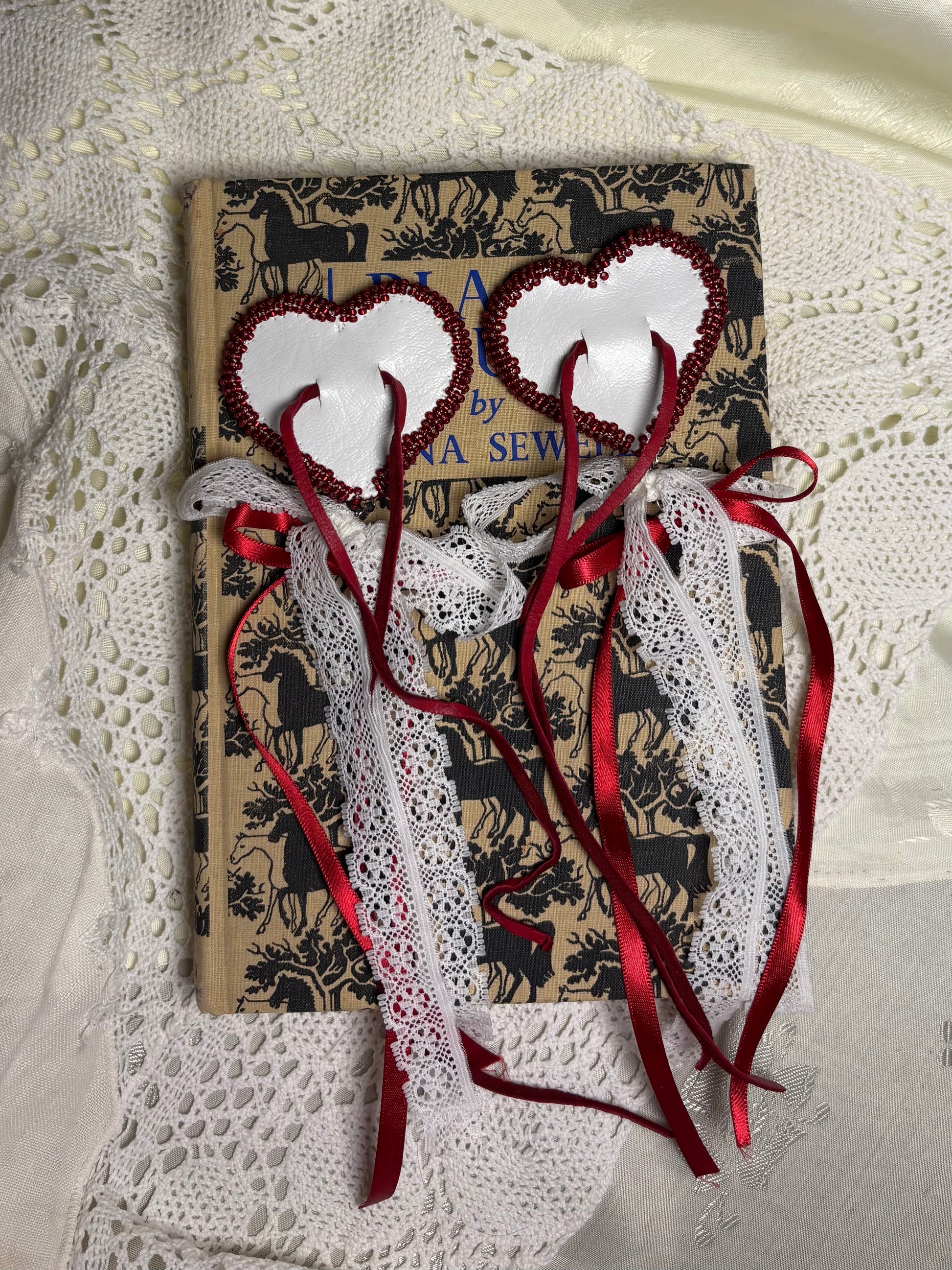 Beaded Hairties that fasten with red deer leather ties (non slip) with ribbon and lace bows beneath the beadwork!